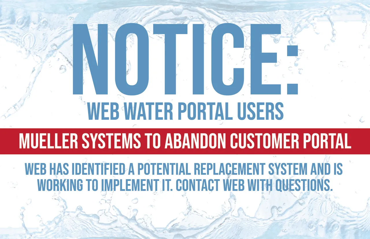 In 2015 WEB contracted with Mueller Systems to provide a Customer Portal. This portal gave our Members access to their individual water usage data and allowed them to set usage alerts. Mueller has informed WEB that it is abandoning the portal at the end of August this year. Therefore, our Members will no longer have online access to water use information and will not receive usage alerts. Mueller has already started this process and many Members have been affected. While WEB recognizes this is an inconvenience, WEB offered this portal as a courtesy, not a replacement for Member responsibility. WEB Members have always been and remain responsible for leaks and damage after the meter pit that may result in excess water usage. WEB has identified a potential replacement system and is working to implement it. Contact WEB with questions.